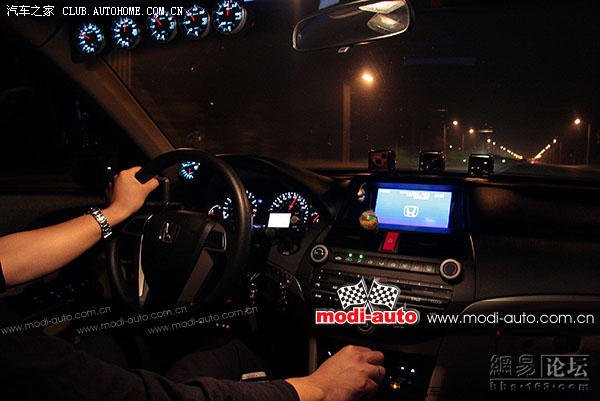 碰巧我们采访的时候赶上调试安装排气泄压装置,完工后参与试车。从车主娴熟的手脚动作配合之后,一股汹涌力量从背后应声而至可以得知车辆的改装调教非常重视与驾驶者的沟通,随着涡轮泄压阀的工作声一股应有的推背感从屁股下汹涌而来到,不看方向盘你不会想起这只是一部绅士雅阁,奈何它能如此撒野??闲谈中车主透露了前任“爱车”是福特的改装FOCUS,可惜FOCUS那副运动性调教的底盘已经被车主玩腻了,最主要为了配合工作和日常需要,向上升级车辆“应运而来”,当然,我们无可否认雅阁是芸芸中高级车里面最具操控性能的一部(无奈福特的蒙迪欧致胜在改装配套支持上远远要比本田车低)。随着鼻孔嗅到一股浓烈的离合片烧焦味,我们把增压值调回0.6BAR,还是待以后再度往上升级离合器后才“粗暴”对待她了,我不是WRX,我不是EVO......