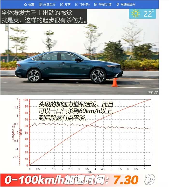 汽车之家测试23款雅阁插混丐版,根据基本款车重1781公斤(推断出顶配车重1810公斤左右),轮胎235/45 R18,零百加速7.3秒,馈电状态零百加速7.4秒(其实是3秒真男人,多测试2次就会11秒了,丰田RAV4插混高性能版就是这样的),最高车速174公里/小时,百零刹车距离38.44米,WLTC纯电续航里程83公里,实测打开ECON模式跑了101公里,平均车速38公里;馈电油耗4.9L/百公里。