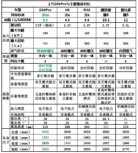 总之,不论是与主品牌H9、RX8相比,还是与撼路者、普拉多(国V),D90从油耗性能、发动机输出最大扭矩、四驱多样化选择以及车身尺寸方面都略高出竞品一筹,建议喜欢越野用户首选D90Pro。