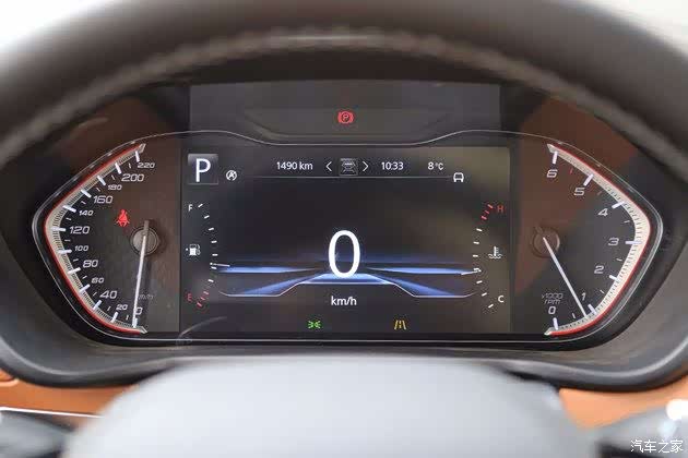 仪表盘采用了机械指针+8英寸液晶屏的组合,左右两侧分别是时速表和转速表,中间是8英寸的液晶显示屏,这块屏幕的分辨率和流畅程度都比较不错。