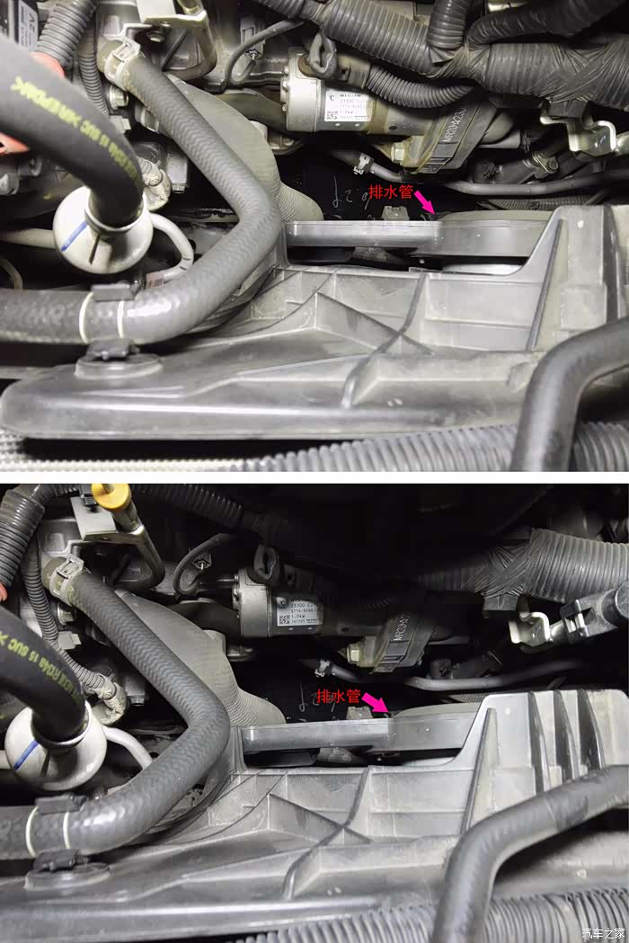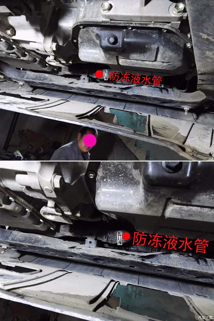 这是佩服厂家节约成本的能力,不仅把防冻液的加注口省去可,连防冻液排水管都“阉割”了,师傅实在没办法了,最后只有把主防冻液排水管拆卸了(图中有说明)。