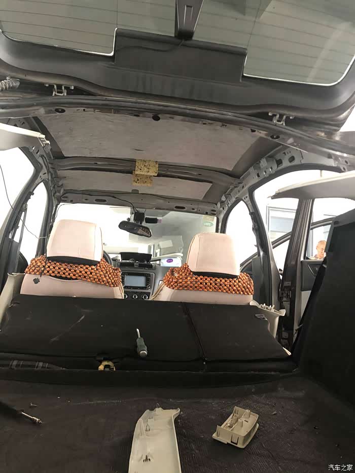 拆除主副驾的挡光板,四门上的拉手,ABC柱,前后阅读灯。然后后排放倒,后备箱打开,顶棚拆下来后从后备箱抽出。