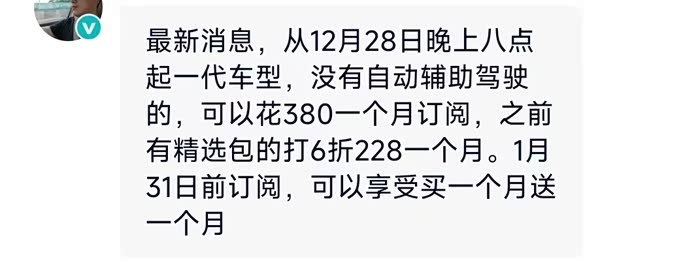 今晚出了智驾服务订阅的消息。从12月28日晚八点起一代车型可以按月订购了。一代车型自动辅助驾驶需要订购吗?买一个月送一个月呢。价格是真的划算!我的只要228两个月。就是不知道实不实用?智驾真的好用吗?