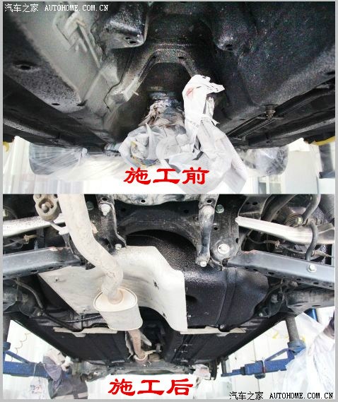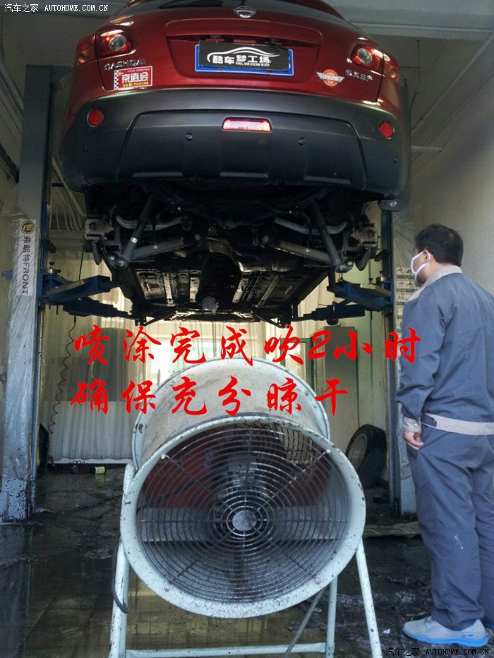 本月是我的逍客提车2周年.买新车时4S赠送了两瓶“底盘装甲”施工过程10分钟搞定.效果不言而喻.5个月后在某汽配城第二次做底盘装甲.这回喷了4瓶.直观感觉黑了很多.开空调时从出风口出来胶皮味.到4S检查被告知.涂料喷到了排气管上.还好免费给清理了。