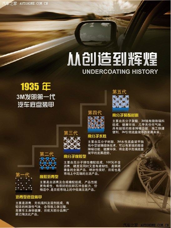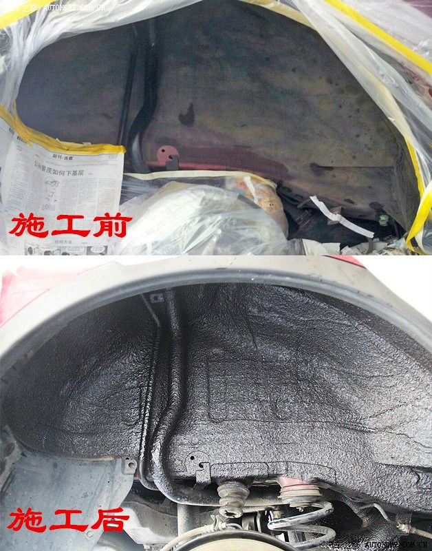 一、产品特点: 1、耐水解,具有优异的防锈抗腐蚀性能。 2、附着力强,耐老化,耐温变性能好,遮盖力强。 3、高弹性,柔韧性好,有效隔音隔热,抗撞击强。 4、以水为分散介质,绿色环保。本产品以水为分散介质,低VOC,无甲苯、二甲苯。在施工过程中不会由于有毒害的有机物的挥发而对施工人员身体健康造成危害。 二、施工流程: 1、用举升机提升车辆,拆除轮胎、挡泥塑料板。 2、必须用洗车高压喷枪将底盘或车厢等需喷涂部位彻底清洗干净,如果旧车有锈皮的则要铲除、砂光,达到无水、无尘、无蜡迹。 3、清洗干净后,用高压喷气枪将水渍彻底吹干。 4、无需喷涂的部位用废报纸严密覆盖、贴紧(包括排气管、车身、发动机、水箱、弹簧、空调冷凝器、车架号码等),勿使喷涂时吹开。 5、摇动本品使罐内物质充分混合均匀后,将防假盖拉开,插入专用喷枪,连接0.60-0.80Mpa压缩空气,然后距离喷涂表面约25-50cm处来回均匀喷射。 6、为防止流痕和松垂,不要一次喷涂太厚,建议分三次喷涂。每次喷涂层表干后再次喷涂,厚度达2mm以上隔音、防锈效果明显。 7、干后去封、装件,完成施工。 8、在使用过程中喷到其它非施工部位,请在胶未干前用浸水湿布擦干净。 三、注意事项: 1、不应在阳光直射或高温漆面上使用 2、在通风较好的场所使用 3、本品不用时请将盖子盖好 4、避免儿童接触。