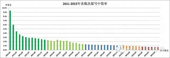 通过历年摇号比例数据可以看出来2011.1 11:1、2011.2 17:1、2011.3 23:1、2011.4 27:1、2011.5 30:1、2011.6 33:1、2011.7 35:1、2011.8 37:1、2011.9 39:1、2011.10 42:1、2011.11 44:1、2011.12 47:1、2012.1 43:1、2012.2 46:1、2012.3 48:1、2012.4 42:1、2012.5 45:1、2012.6 47:1、2012.7 46:1、2012.8 53:1、2012.9 58:1、2012.10 59:1、2012.11 67:1 、2012.12 71:1、2013.1 75:1、2013.2 77:1、2013.3 80:1、2013.4 81:1 到了13年底已是100:1,可以说此阶段只是摇号难,但还在一个理性的范围内,供需矛盾还不算突出,借网上的一张图片可以看到,到了15年中签率从9.39%一路直降到6.96‰。