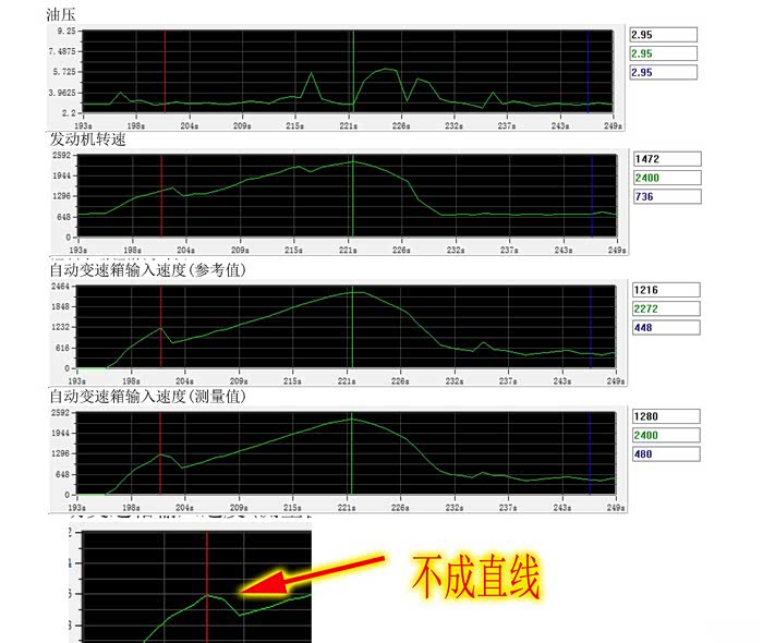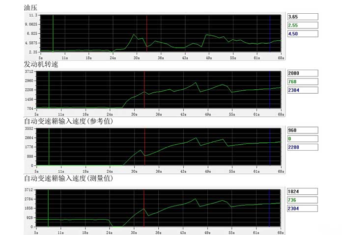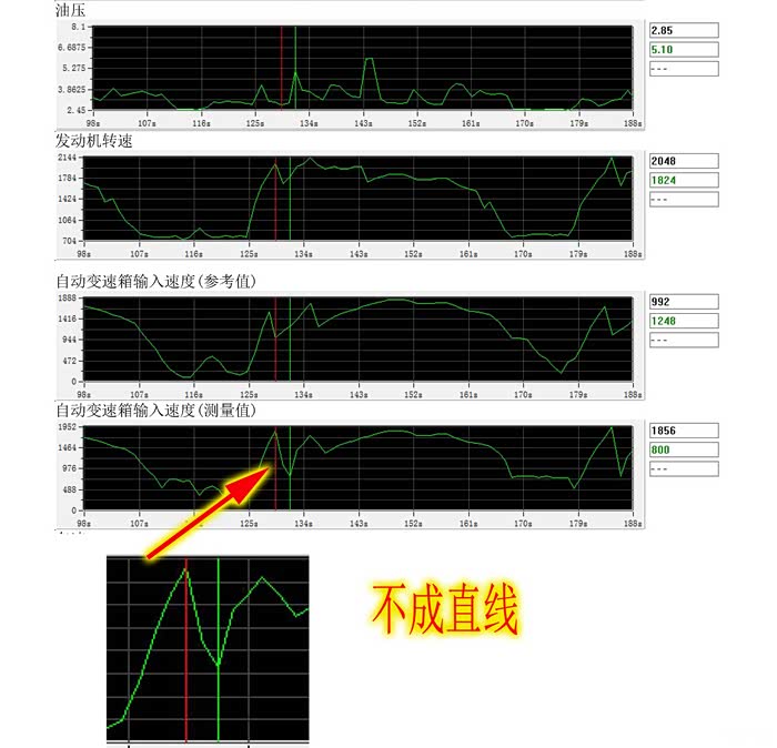 06版 ECU,油压调整后,1升2 输入轴转数成直线,D档油压高于3bar