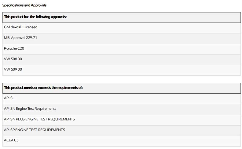 认证:Porsche C20,VW508/50900,GM dexos D(DD40BCCB015),MB-Approval 229.71;