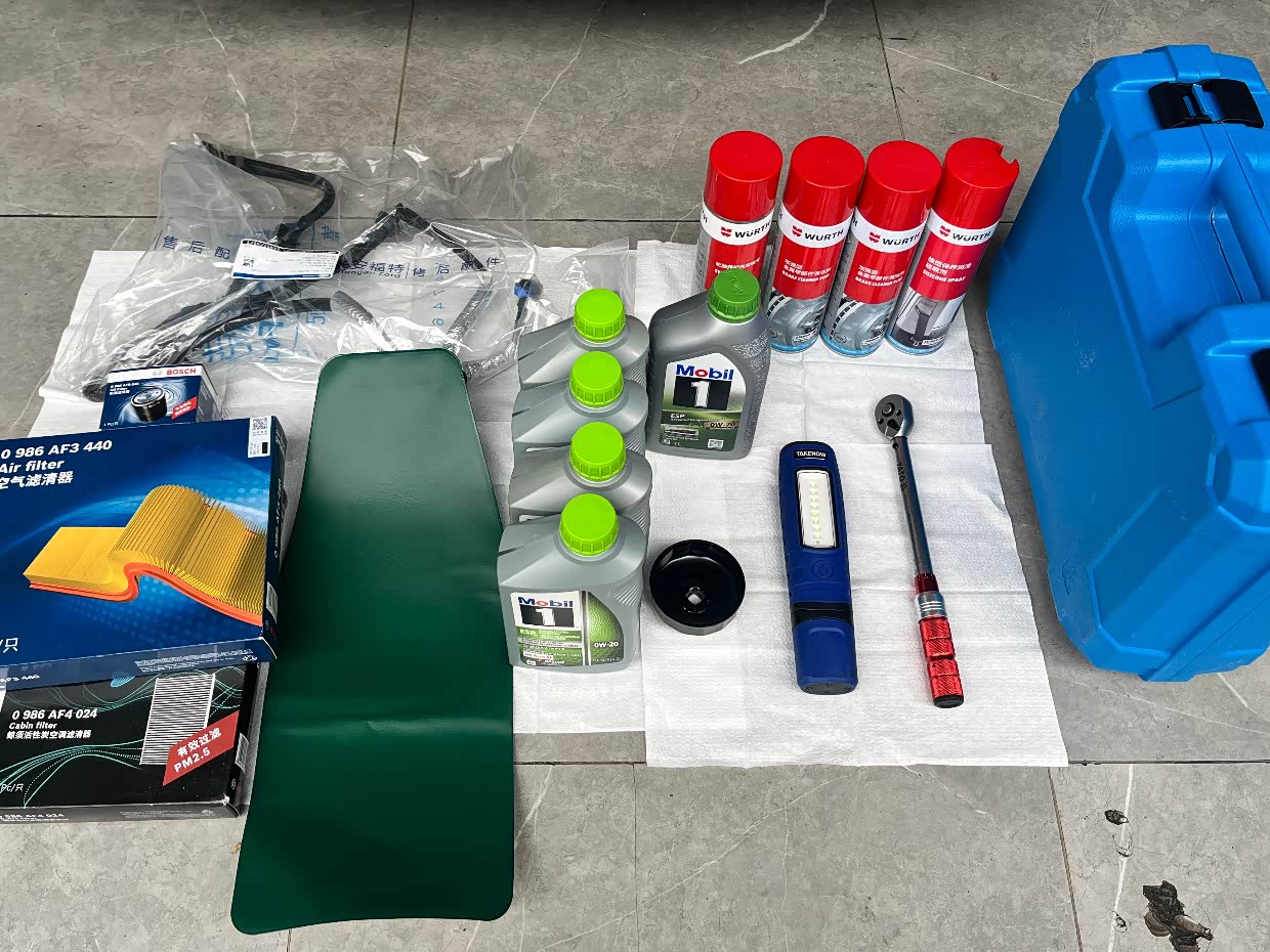 材料清单:博世空滤(0986AF3440),博世空调滤(0986AF4024),博世机滤(0986AF0545),碳罐电磁阀总成(JX619D289ZF),机油加注套装,NGK扭矩扳手,SATA机滤74MM套筒,伍尔特加强型清洁剂&橡塑保护剂,除油纸,丁腈手套,可塑导油板,磁吸照明灯;