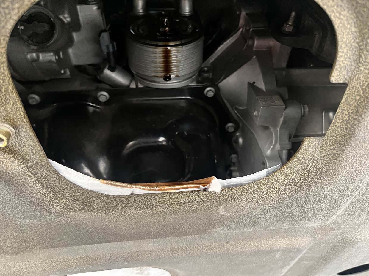 拆卸机滤,静置滴油1-2分钟,因窗口小,用导油板接油,提前铺好吸油纸;