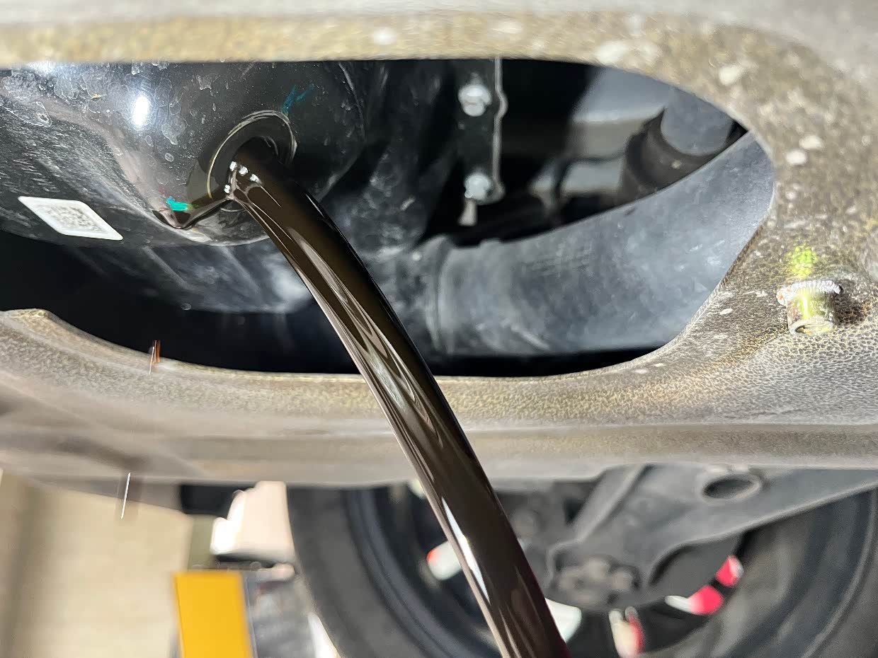 定量加新油,倒入机油加注套装,此次加注4.2L(4QT+1/3QT),放置好机油加注套装,开始加机油;
