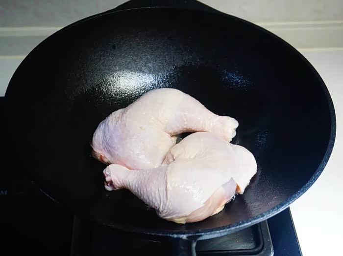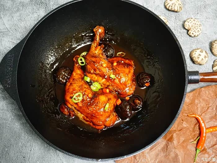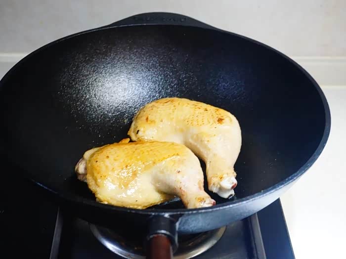 过程中翻一次鸡腿肉使鸡肉上下上色更均匀,(之所以用铸铁锅来做就是因为导热均匀快捷,储热性能强,与普通所谓无烟锅、不粘锅相比,其特有的锅体无涂层设计从根本上杜绝了化学涂层和铝制品对人体的危害,在保持不破坏菜肴的营养成份的情况下使全家尽享健康与美味。)