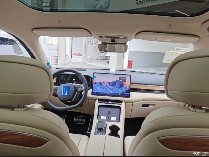 2 内饰方面,首先从整个中控台的布局来看,问界M5的座舱设计十分简洁,但又不失豪华感,整个内饰采用了大量浅色皮质材料包裹,搭配木纹饰板,颇有一种高端品牌的既视感。