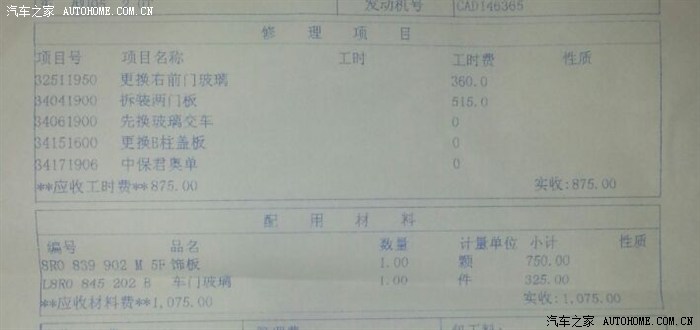 更换的项目包括B柱的饰板和副驾驶的玻璃其中B柱饰板的工时费是257.5,因为需要拆后门板,这点没异议。
