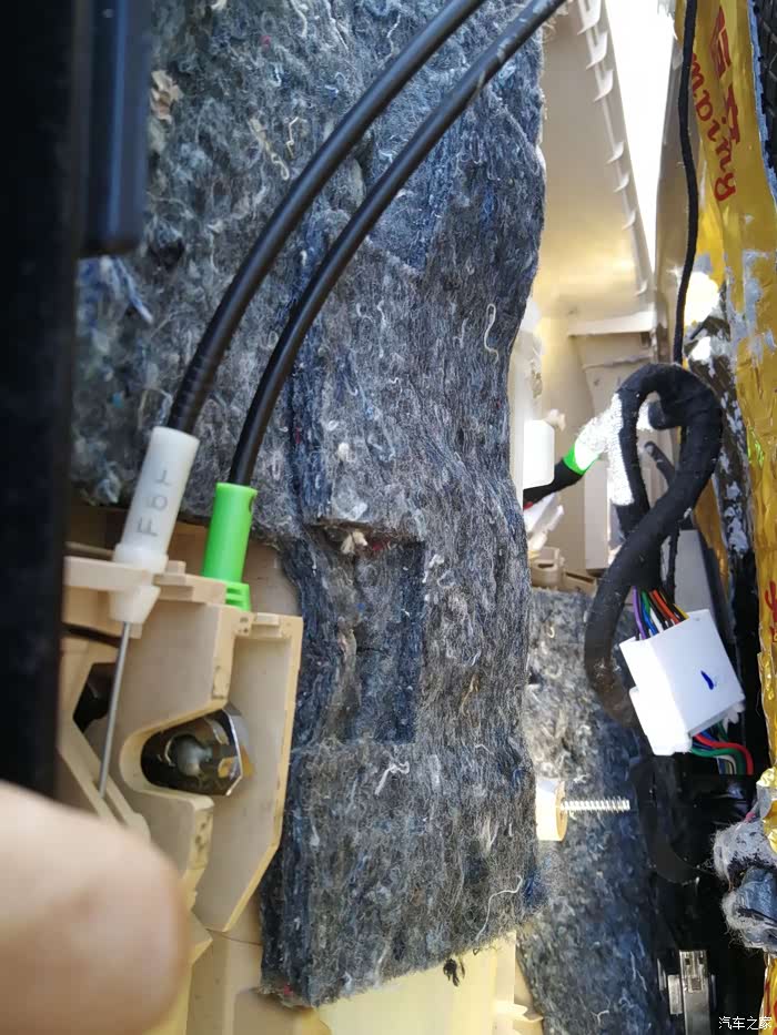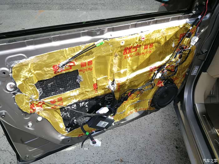 上图是把门板拆掉的状态,里面的线束大家可以无视,因为我加装了自动折叠后视镜,其次做了四门隔音,四门隔音材料用了二种,一种就是普通国产舒宁隔音材料,还有一种是STP进口航空隔音材料,就是黑色部分,相信了解隔音的都知道这个品牌
