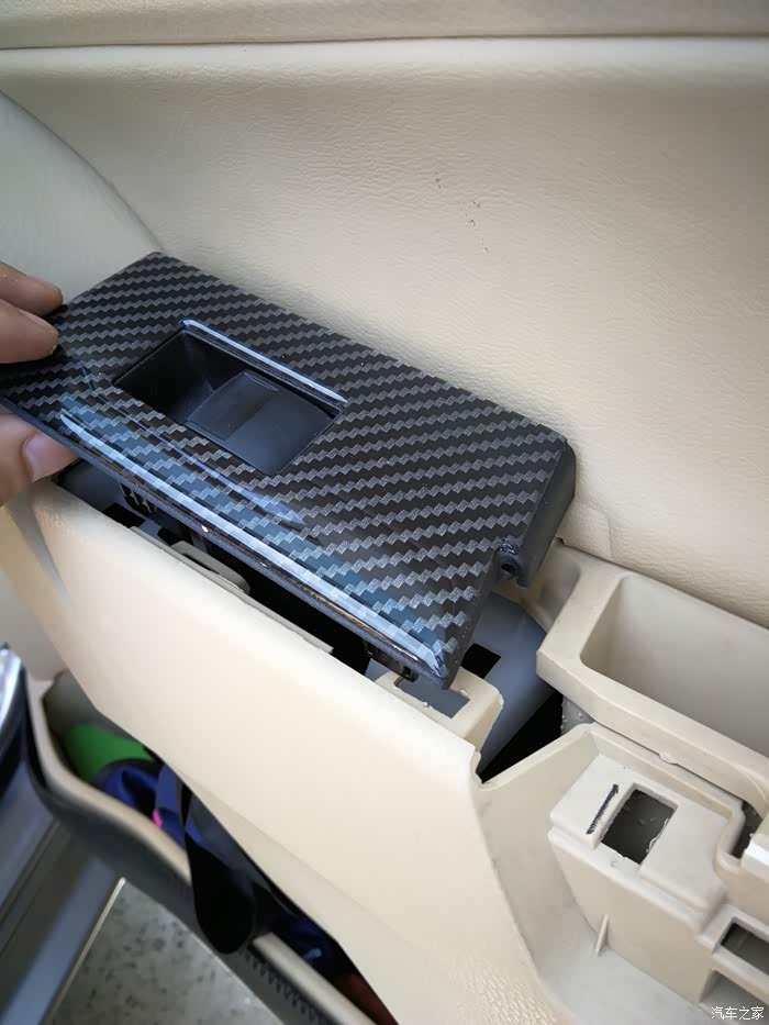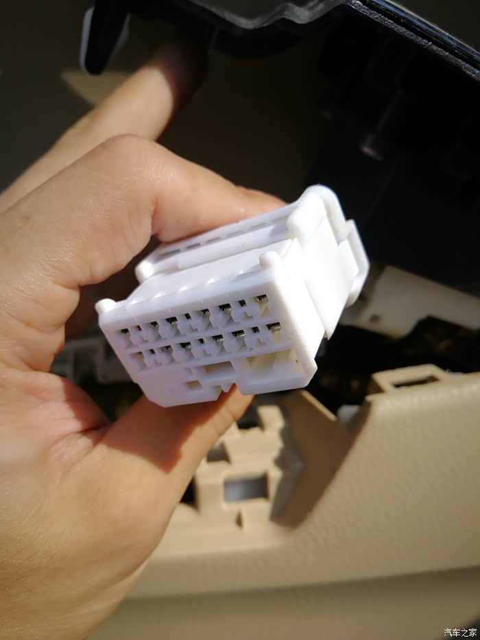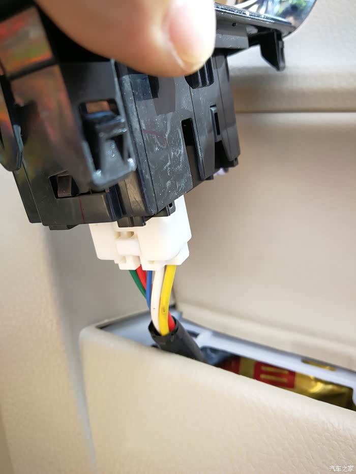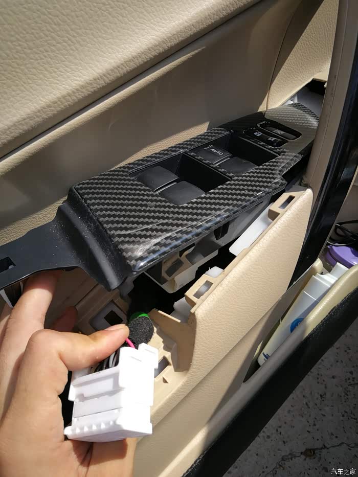 拆完哪块真皮手垫,然后再把前面一块车窗开关总裁也卸下来,因为我贴了碳纤维膜,原色是黑色的,方法和前面一样,我就不多说了,在撬开后会有一个总成插座,白色的,如图