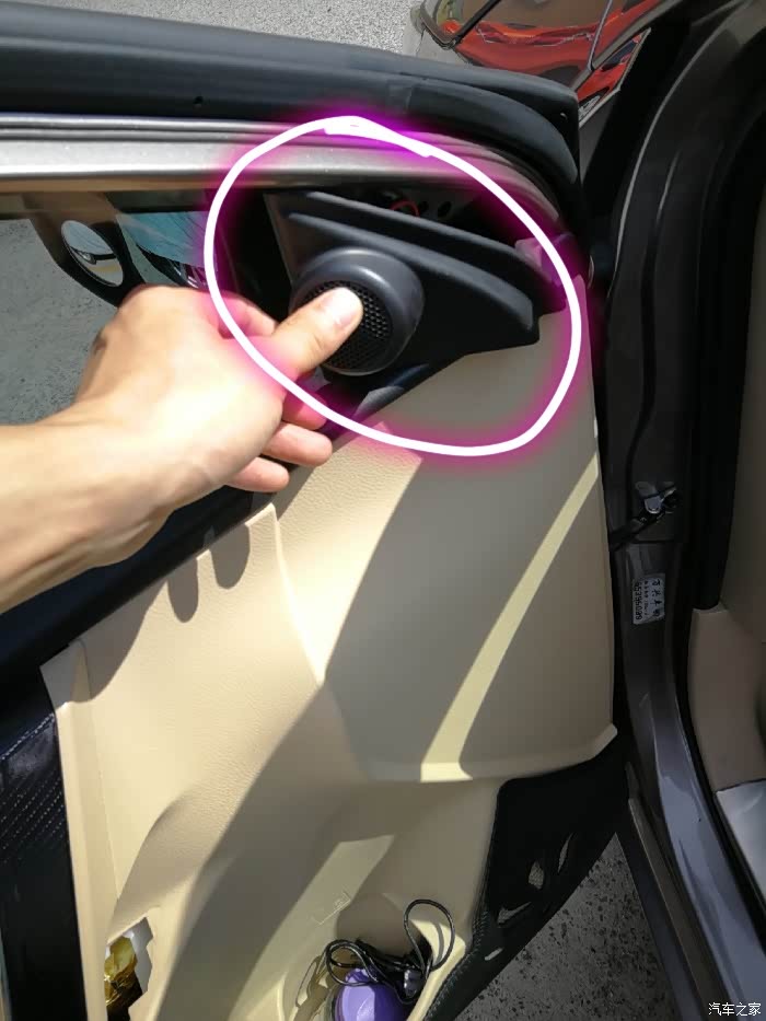 在卸门前别忘了把这个小喇叭也拆下来,因为喇叭是靠门板和车窗上方再加喇叭内部一个塑料卡扣固定的,别忘拆下来。