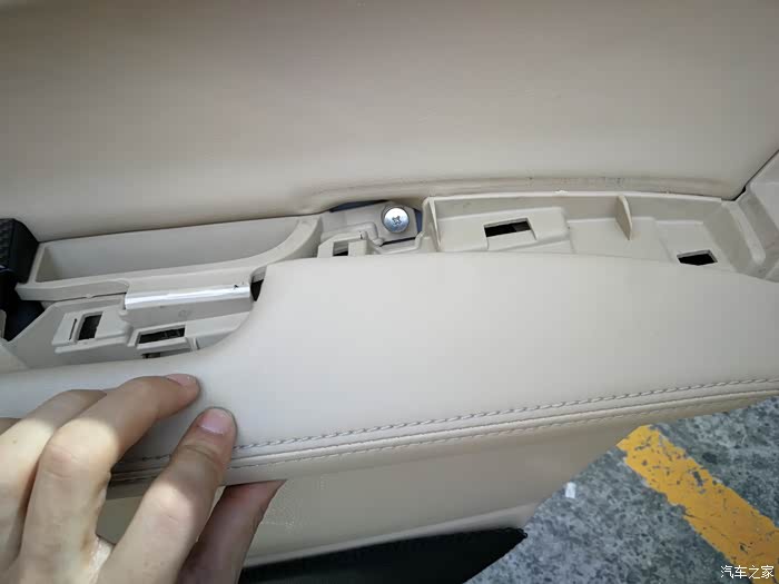 先和大家展示主驾驶门板,副驾驶的门板和主驾驶拆法一致,所以我就按照主驾驶门来做暂展示,首先主驾驶有个扶手,就是图片我手指指着的这块,在拆开时可以用塑料翘板在扶手的上顶端缝隙用巧力一撬,在用手辅助往外稍