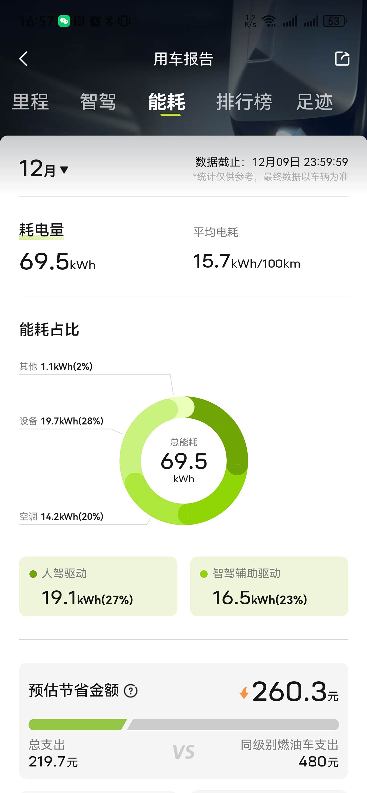 不过车上显示的动态续航会更保守一点。53%的电,系统预测还能跑259公里,折算下来满电大概只有439公里,和之前估算的530公里有点差距。不过二者取其低总没错。