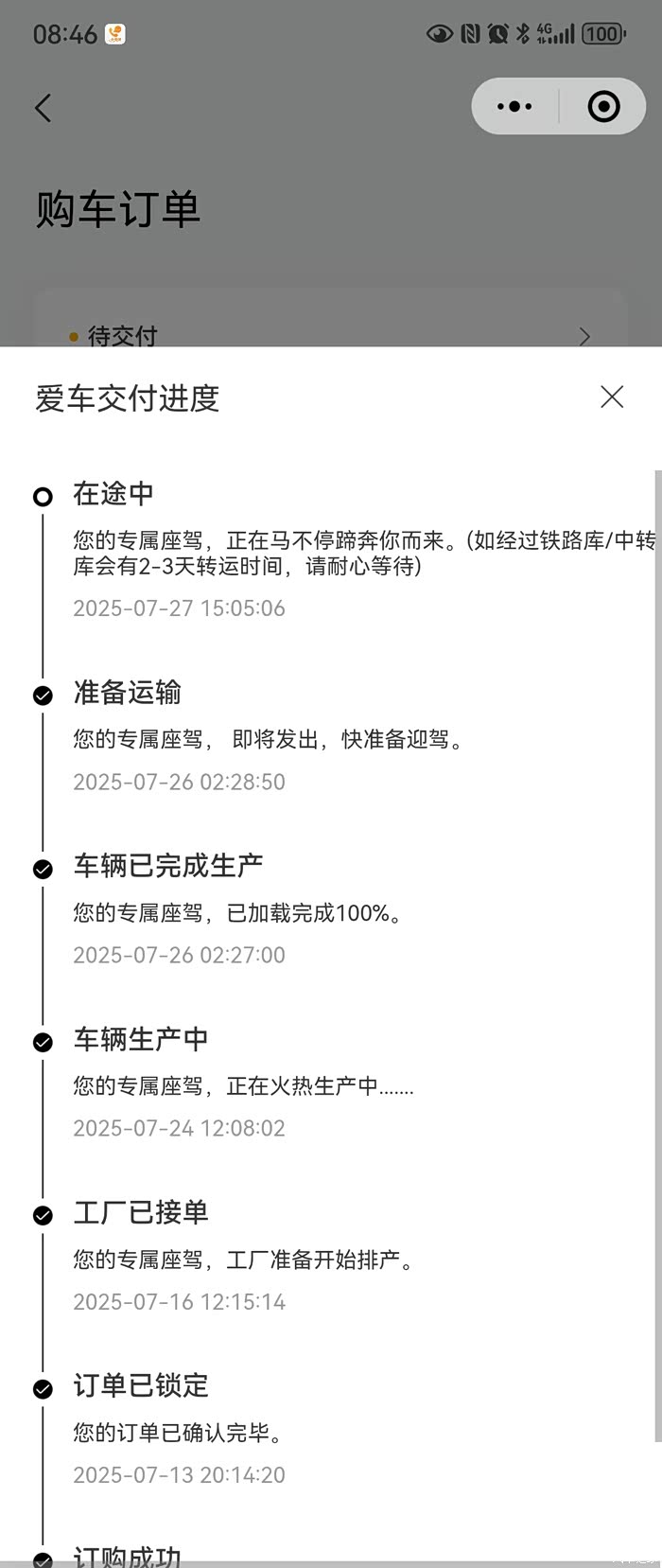 首先,知道高山8是通过某音上的某教官事件开始了解有这个车的,刚好也有换MPV的想法,先去试驾了一下高山8,当天下午又试驾了梦想家。横向对比配置差不多的情况下,价格是高山比较有优势,而且不用分高低配,梦想家的配置版本实在太多了。最后和老婆一商量就订车了,当时其实了解真不多,就试驾听销售说了一下,就是图个眼缘也有这个意向,就直接锁单了。选的灰外白内,无现车等排产,提车周期比我想象中的短,7月13日小程序交5000元下单+锁单,7月29日车子就达交付中心了,31日提车。