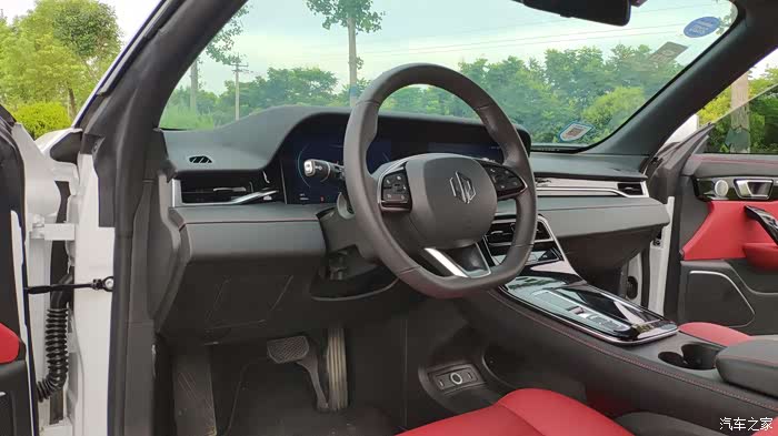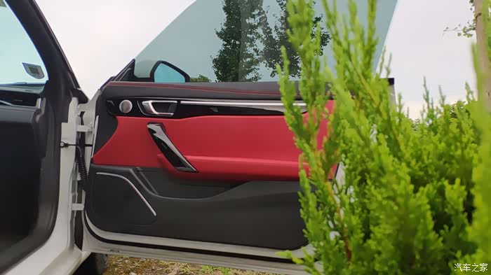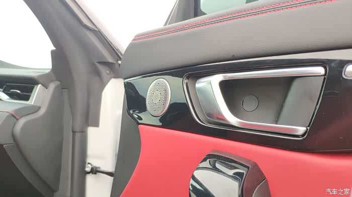 车门是无边框设计,轿跑和跑车的设计风格。但是我个人还是比较痛恨无边框门的,后期胶条老话会有漏水风险。不过无边框设计整体档次感就上去了。车门下部分是塑料,红色部分是皮质,手感很好,上边红色缝线部分的也是皮质。门把等地方用了钢琴烤漆,开门锁很有金属感觉。这样整体的档次感就上去了,但说心里的,像我这样的粗人,钢琴烤漆面料很难去养护。