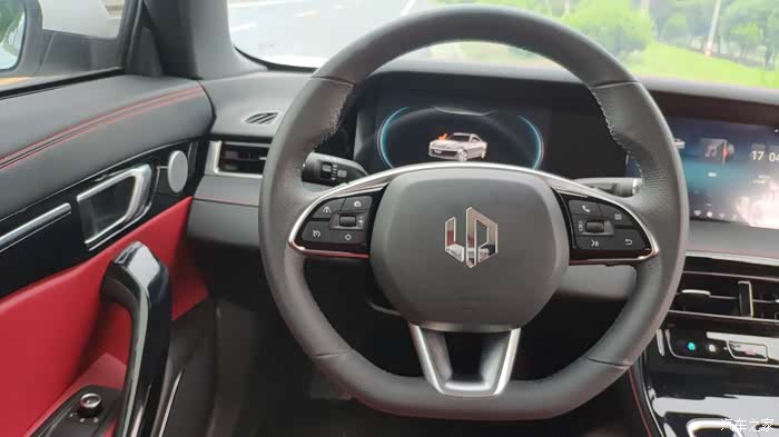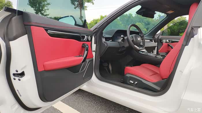 零跑的内饰整体是运动风味,毕竟是电动小跑车,红色的座椅,门,挡风玻璃下面位置,很多都用了皮。质感不错,缝线很整齐。