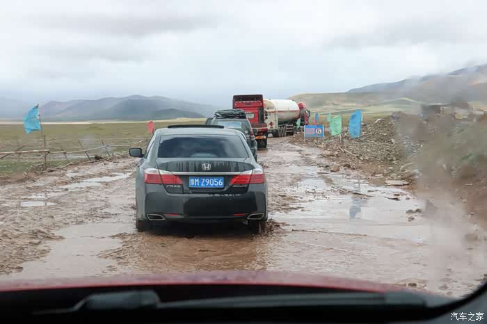 我们继续往纳木错赶过去,从青藏线转入纳木错的路很烂,刚好遇上了雨水更烂,根本开不快。开了很久终于快到纳木错了,但前方堵起车来,偶尔看到对面车道有车开过(后来才知这是掉头回去的车),等了有10几分钟一动不动,我们下车去前方了解情况得知在今天下午2点半左右通往纳木错的两座桥塌了,现在再紧急对应中,暂时无法前进。我们听到这个消息,大家也只是觉得有一点可惜而已,因为大家都知道雨一直下就算去到纳木错也只是看到灰蒙蒙的一片雨水在湖面溅起波纹。就这样我们在附件吃过晚饭后,决定离开这一片下雨的天空,晚上去到那曲落脚找住宿,一路开着渐渐地天已黑了,雨还一直下,这时的青藏线能见度不到10米,我只能放慢车速慢慢开,这样一开直接开到晚上的约12点钟才到达那曲。