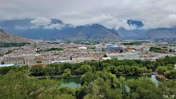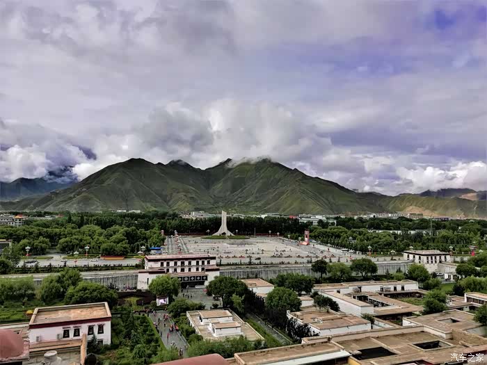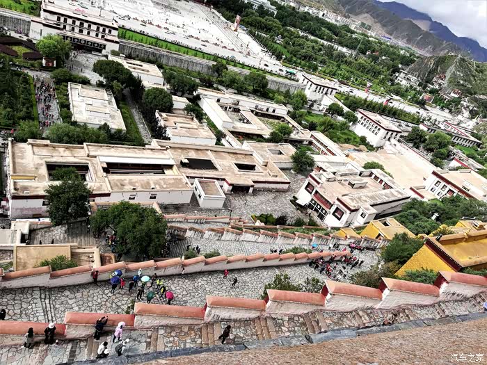布宫上俯瞰山下雪城和马路对面的布达拉宫广场