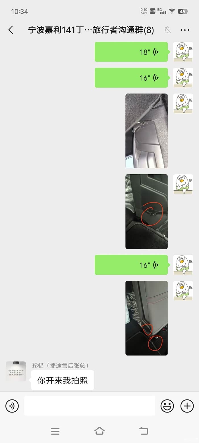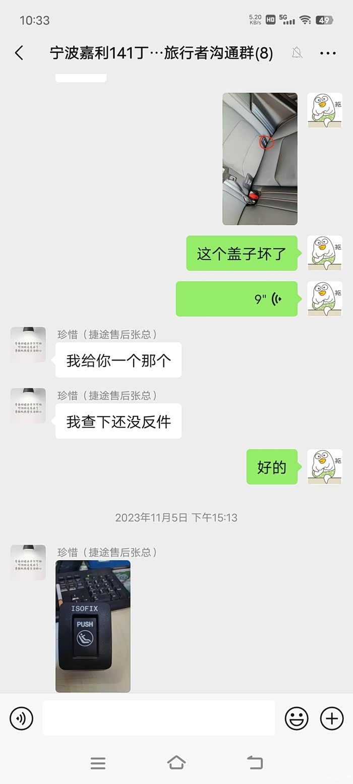 1,首先是由于我是宁波的第一台旅行者,发布会盲定,车子到店后做了几天展车,后排的座椅被人随意的上下起放,后做边上的皮有一点被刮破了,拍了照片发给了这家店的售后,售后的张经理二话不说,直接向厂家申请了全新的座椅,给我发过来!