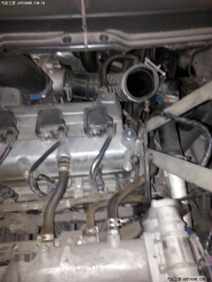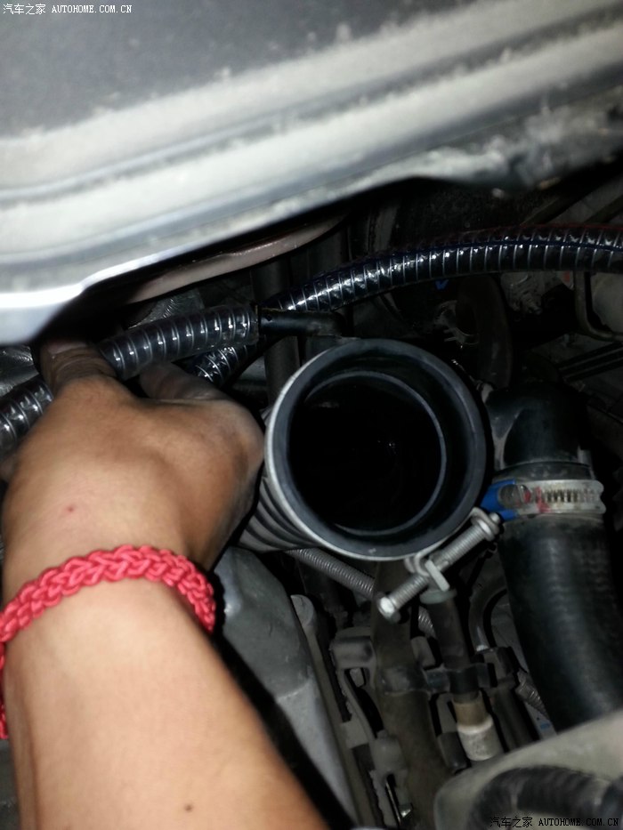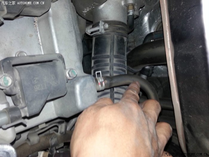 下面指的这个小细管就是发动机曲轴箱的机油蒸汽二次进气管,也是我们要在这里加装油气分离器的地方: