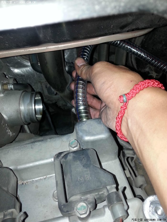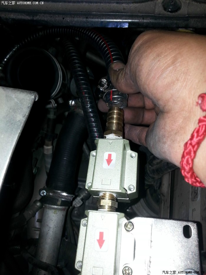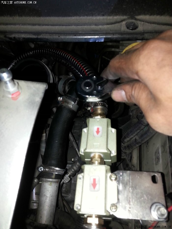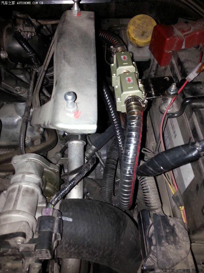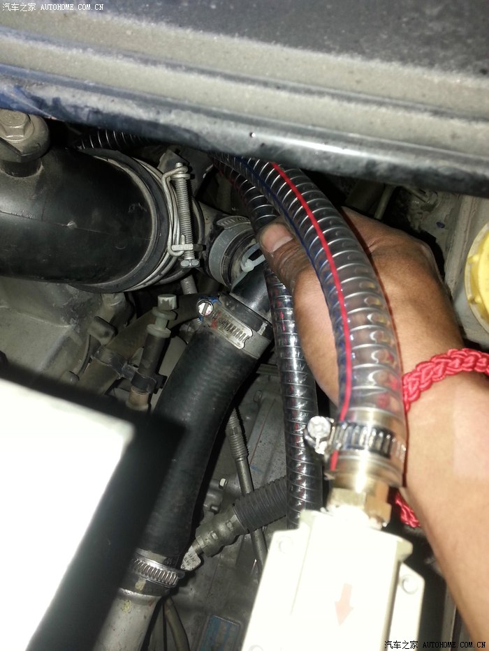 拔掉这个管子后,接上分离器的管子,我用的是耐高压,耐高温,耐油的钢丝管,一端接在排气上,如图: