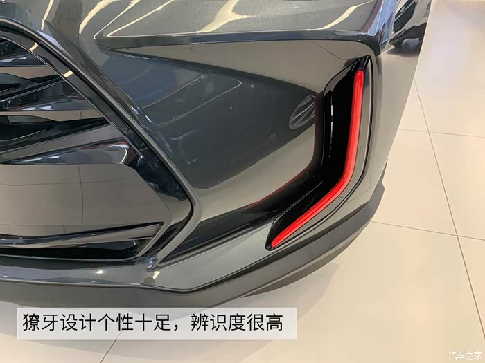 车头熏黑格栅造型配以两侧獠牙一般的保险杠设计,显得十分有气势。两侧导风口,既能给前轮刹车散热,也能优化车身的空气动力学表现。