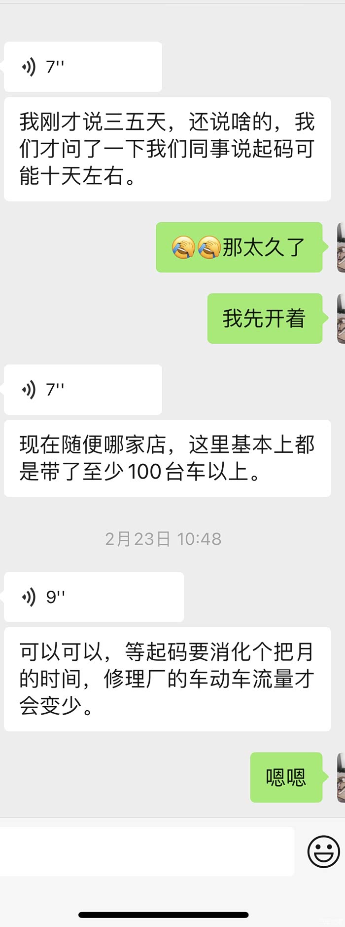 半个小时后,4S不知道哪里知道的消息,打我电话,问我是不是需要修车,我说我有你们同事微信,我发给他先看一下,我大概问了一下,说现在修车的比较多,得排队,大概需要十天,积累的车太多了……