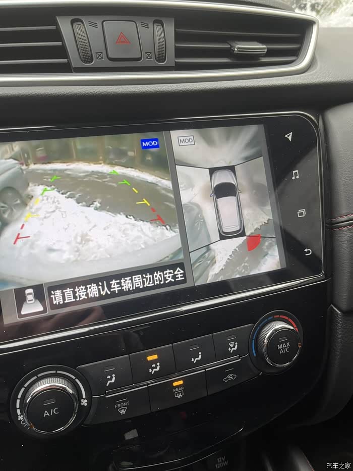 倒车时发现雷达监测到障碍物了,我没管,结果给我自动刹停了,倒不了,没办法下车清理车轮下的积雪,清理的不够,车轮打滑,只能再次清理……