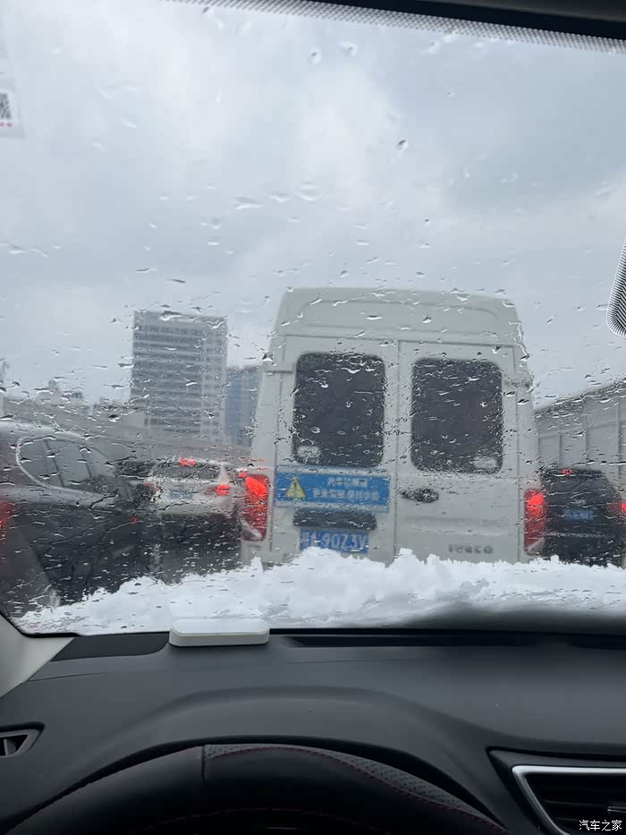 暖风打开后,冰晶慢慢融化成水珠,好多了。就是三股道,只有一股道能走车了,所以很堵。