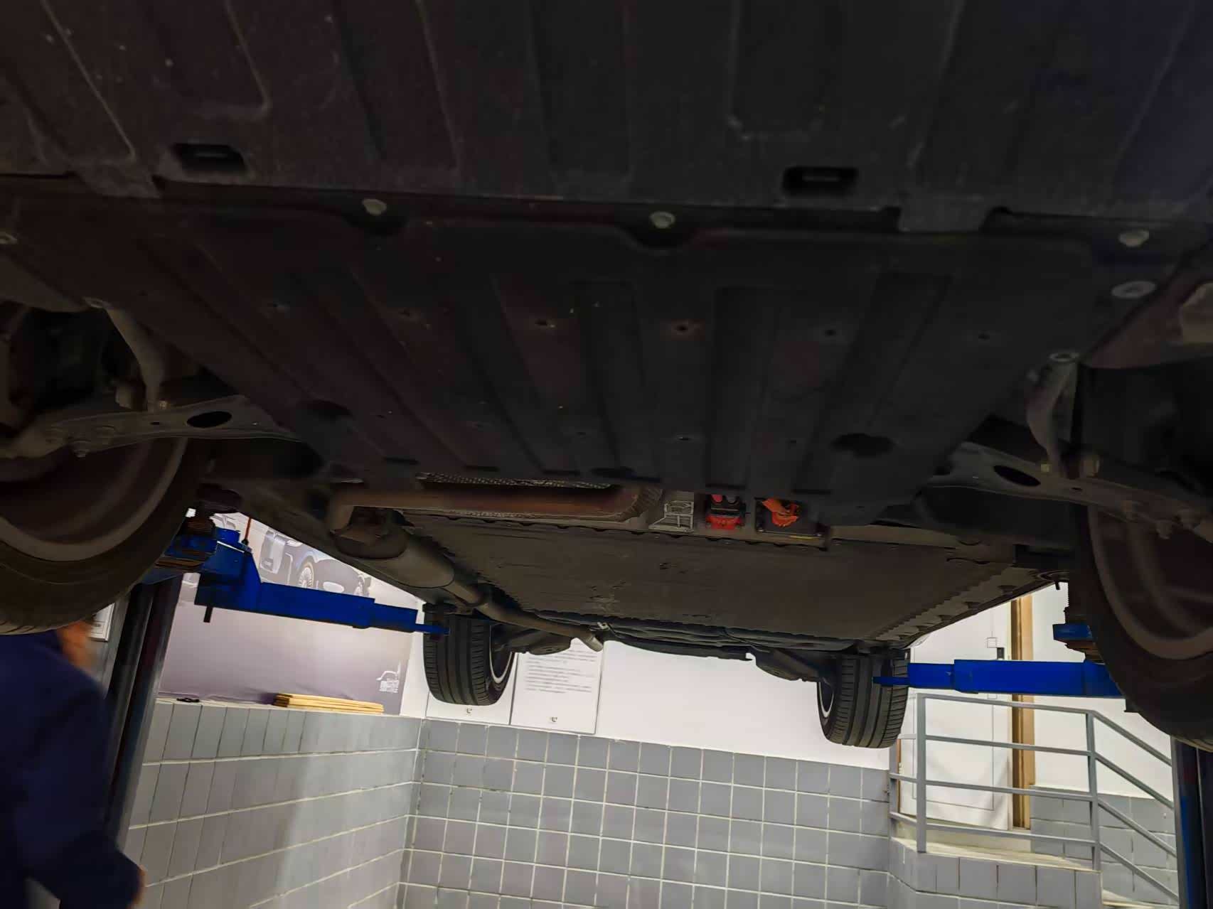 车辆被平稳举升,底盘全景一览无余。技师的第一项工作,是对底盘进行系统性宏观体检。