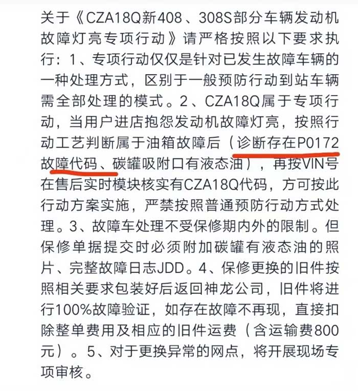 后来了解了一下,早期的油箱存在设计缺陷,油箱加满油后容易导致碳罐进油,然后碳罐的油气送往发动机,导致发动机混合气过浓,严重时发动机会异常抖动甚至熄火,存在安全隐患。但是标致没有大面积召回,而是碰到报故障的才进行免费更换。