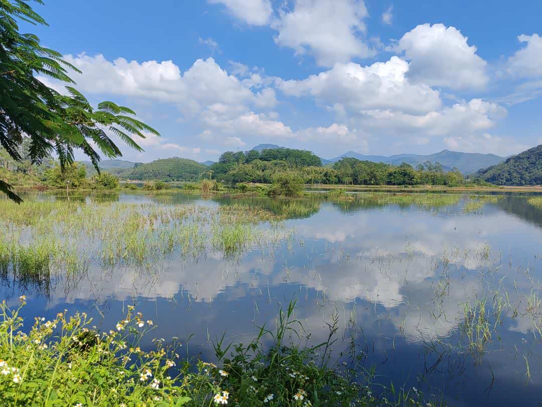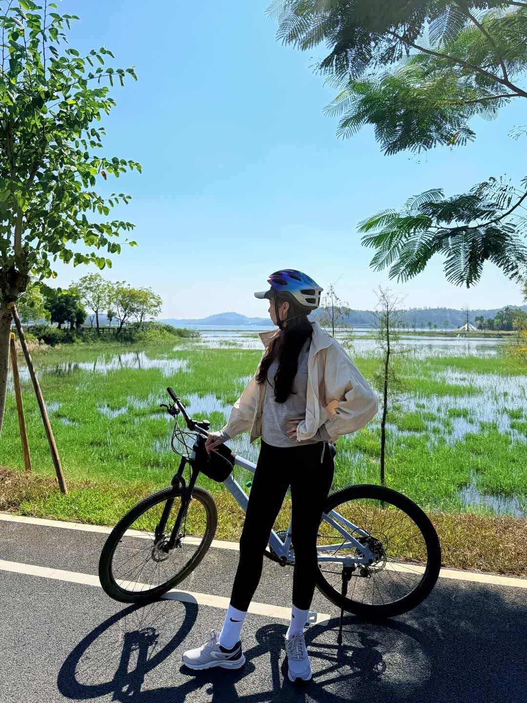 午后阳光变得柔和,我们从后备箱取出折叠自行车,准备环湖骑行一段。从北岸停车场出发,沿着湖边的柏油路骑行,路面平整,沿途绿树成荫,不时能看到民宿依湖而建,白墙黛瓦搭配湖光山色,推开窗便是湖景,格外雅致。