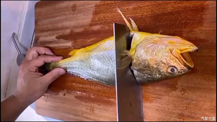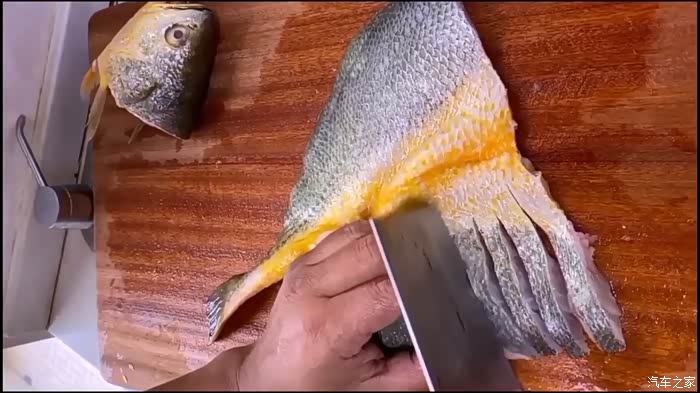 黄花鱼清洗干净去除内脏,将鱼头切下。