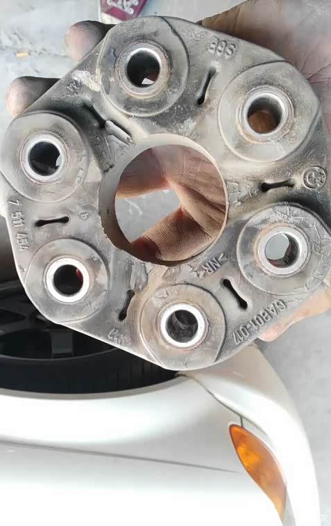 其次先松了传动轴,传动轴连接的胶盘也已经龟裂不堪,变的非常柔软,一只手就捏动了。