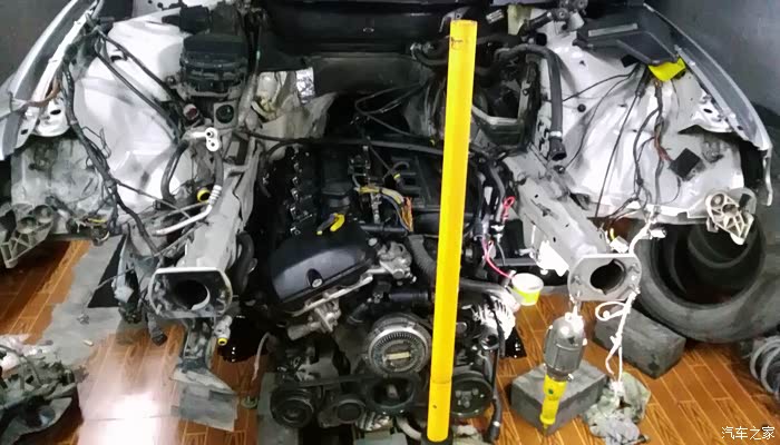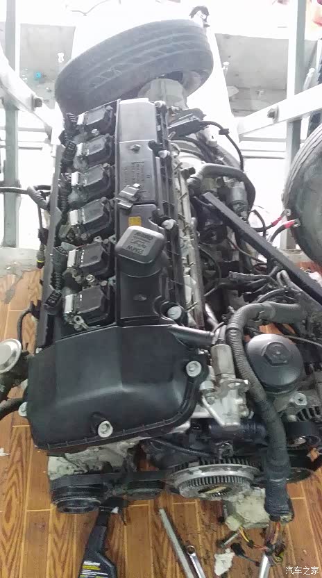 发动机连带变速箱一起下来,快速省力,松开变速箱挂挡拉线,发动机连接车身上的各种水管,空调管,发动机大线跟车身大线分离开。