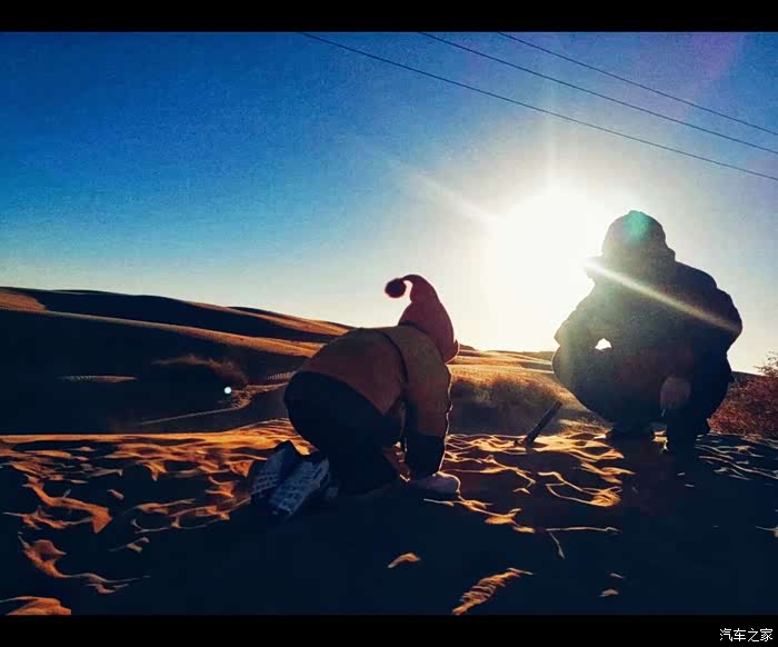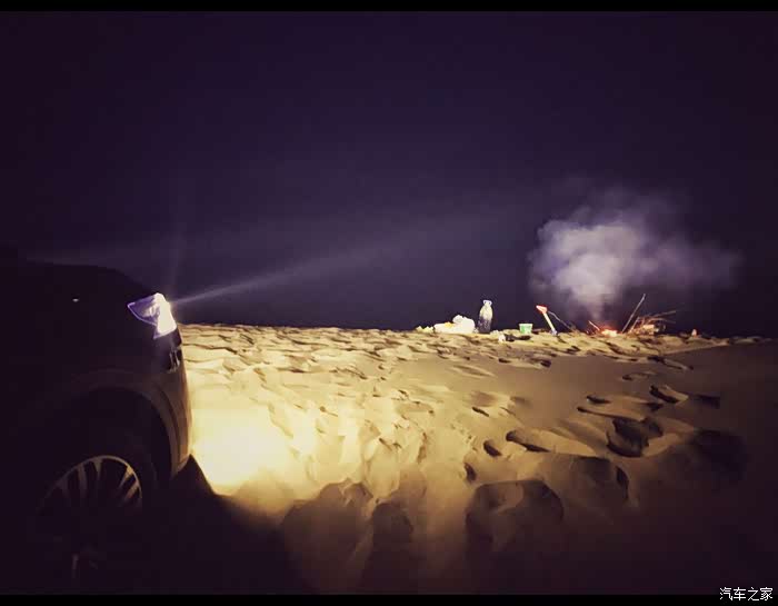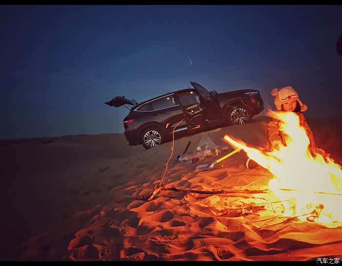 首先找到一个相对避风的沙丘下面,然后挖个大坑开始生火。因为不能长时间在车里睡觉这样是很危险的。对于孩子来说玩沙子和玩火都是很开心的,而且沙漠里生火是可以被降解的,而且也不会因为火星引起林区大火。