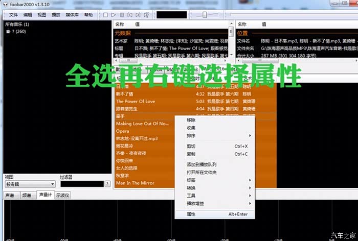 接着把单个文件夹内的歌曲全部导入软件列表,全选后再右键选择属性;