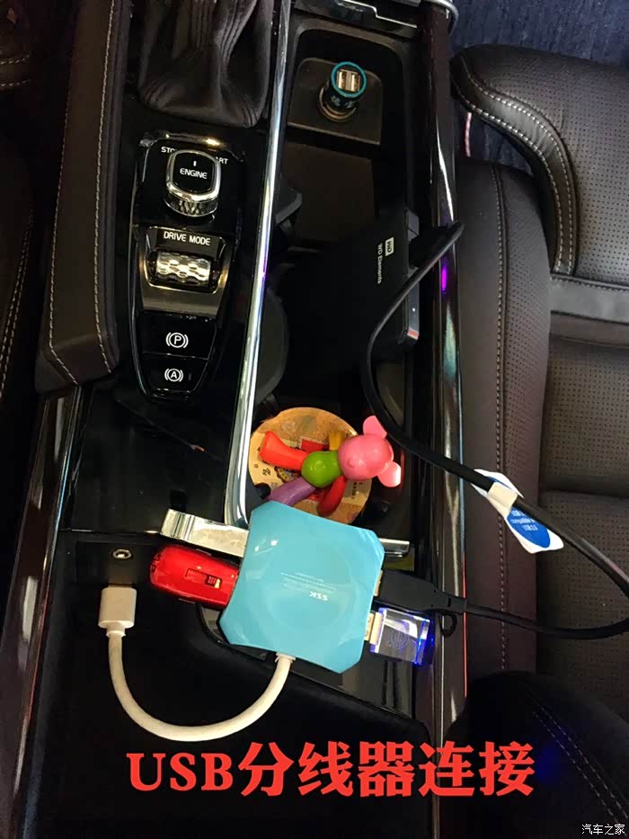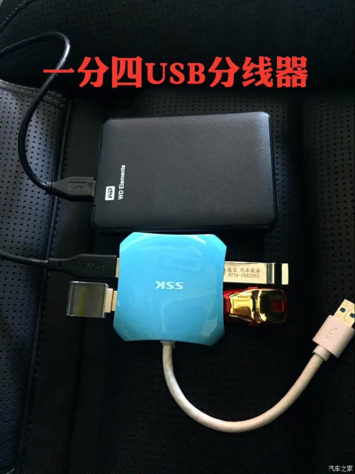 ,很多车型不能读取,只能读取MP3一类的文件。这款车型虽然只在中间储物箱只设置了一个USB接口,但是可以利用USB分线器集合使用多个U盘,我买的是一分四USB分线器,测试的时候使用了一个1T移动硬盘+一个256G U盘+两个8G U盘,四个USB均能读取出来完美使用(单独2T移动硬盘测试过不能读取)。1T的移动硬盘都能读取出来,就意味着可以把自己喜欢的大量歌曲放入硬盘,当时觉得好嗨森,当把歌曲全部分好文件夹放入硬盘播放时,却傻眼了…..