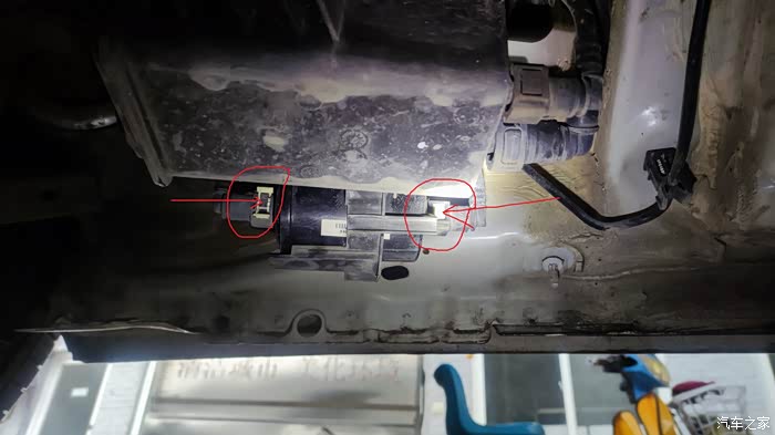 找个地沟。卸下车子左后部分的护板三颗螺丝。就可以看到汽油滤芯了。这张照片是站在地沟里边面向车子左边拍摄的。红圈的地方,左边是一个钢片卡扣,右边是一个按压式的快拆卡扣。