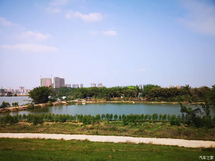 江边吹吹风的风景,旁边还有一个鱼塘,有钓鱼爱好者在钓鱼