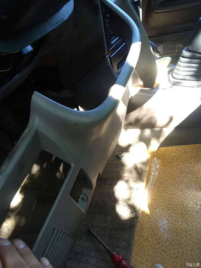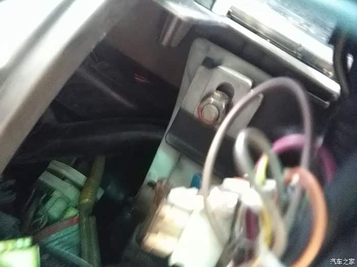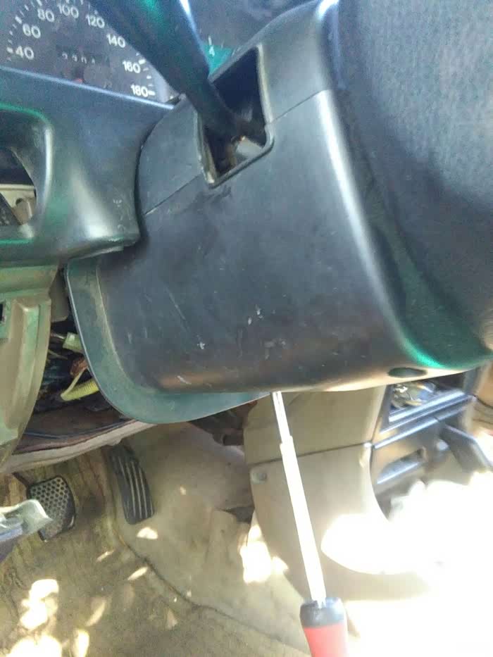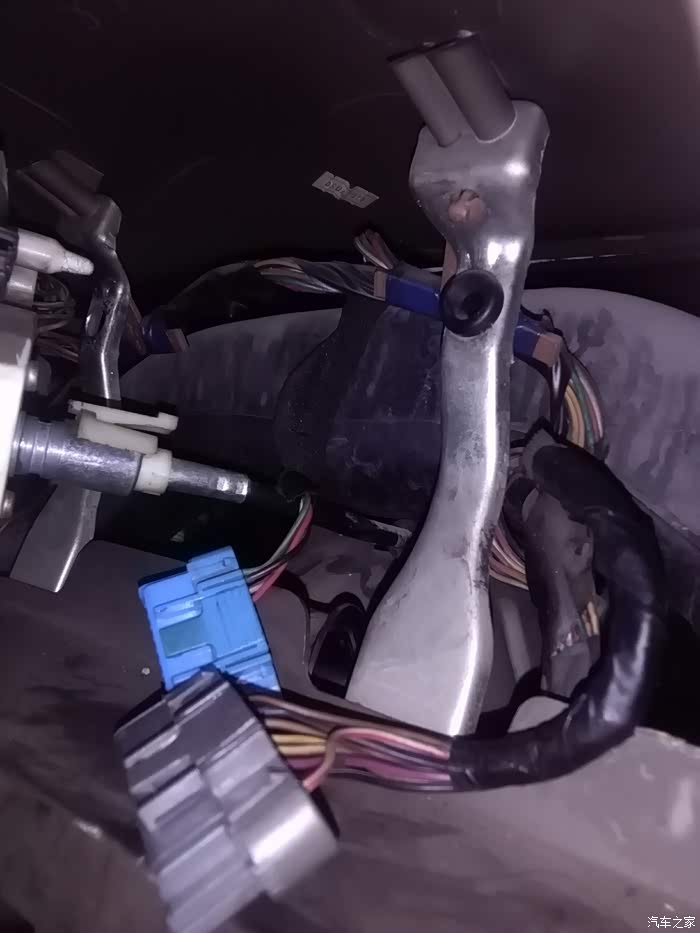 然后拆下方向盘下面的那个壳子,也就是装双闪灯开关的那个,从下面有两个螺丝锁住,上下两半还有卡销卡着呢