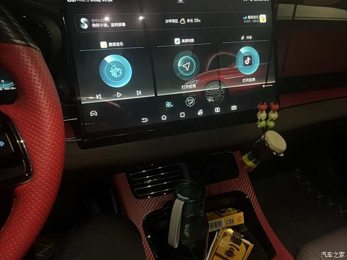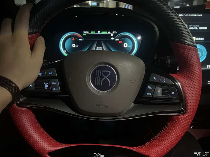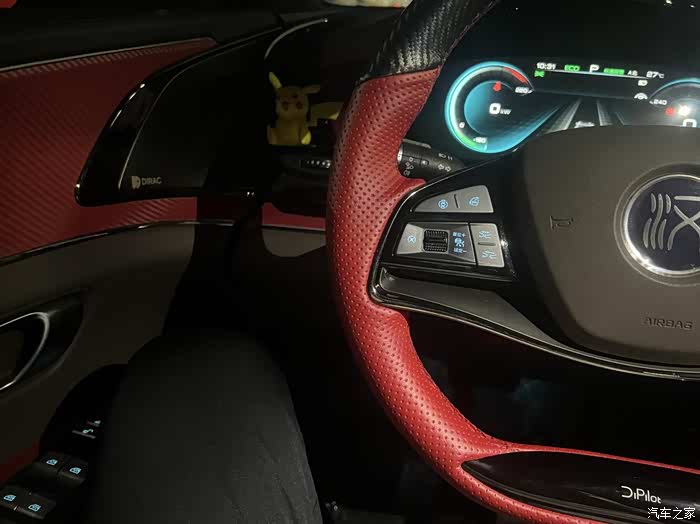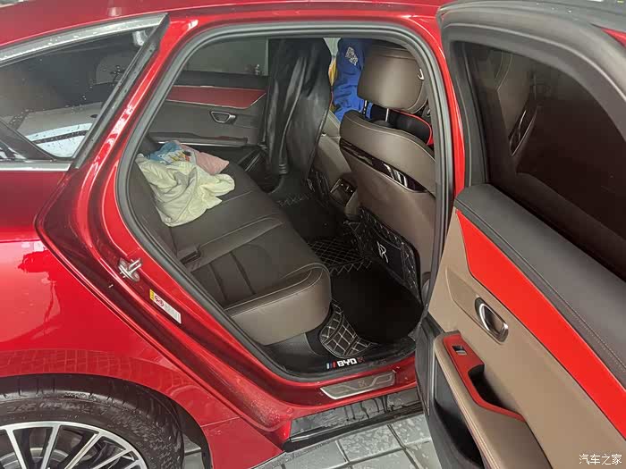 我这辆汉EV的内饰在颜色方面和外观颜色相呼应,用了红色作点缀,显得很有时尚感。平底的方向盘、宽大的手枕以及厚实的座椅营造出比较高级的氛围,坐进车内,可以让我瞬间放松下来,再来一首舒缓的音乐,一切都是这么的惬意。