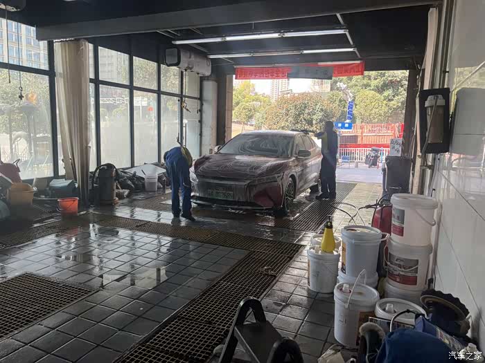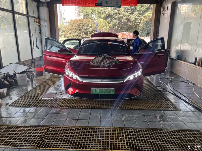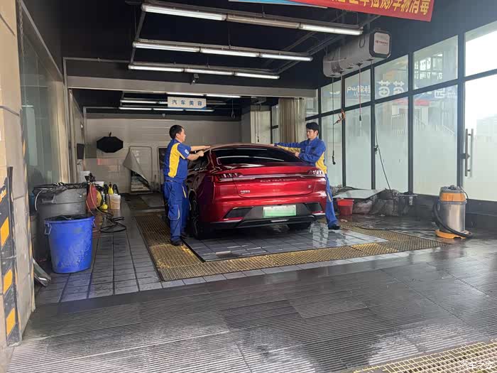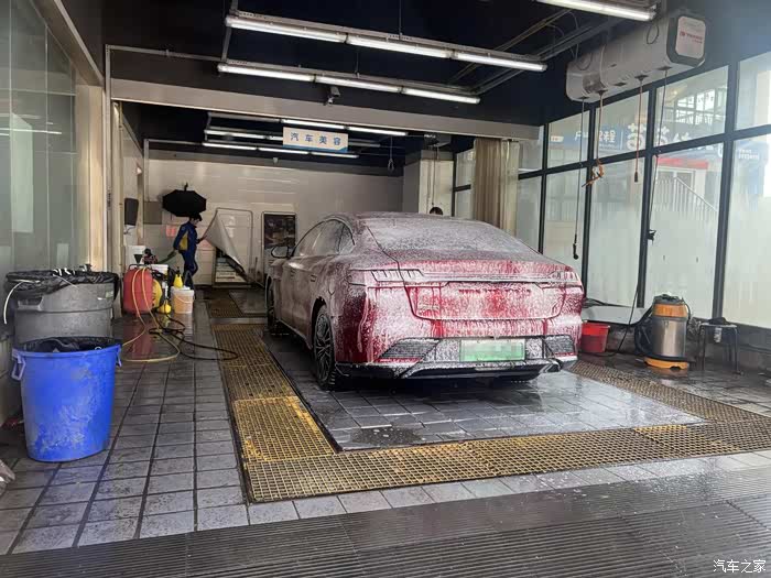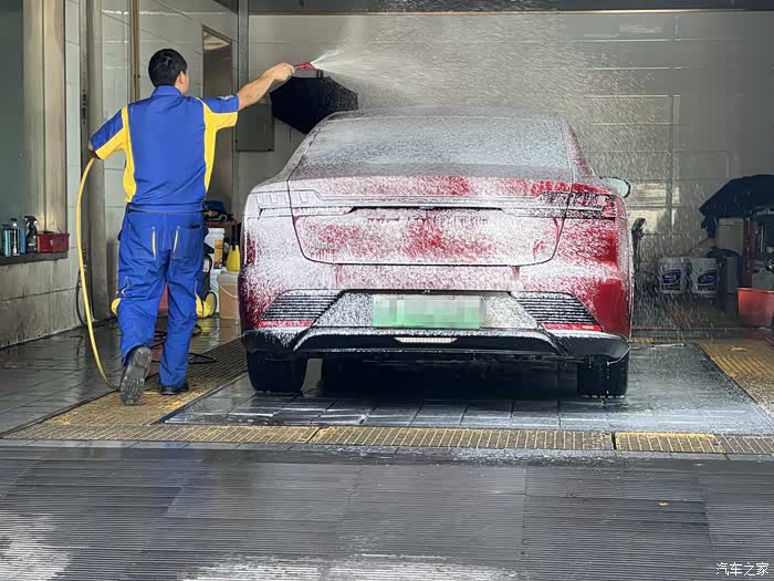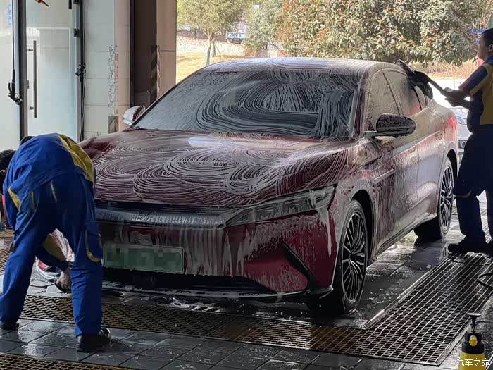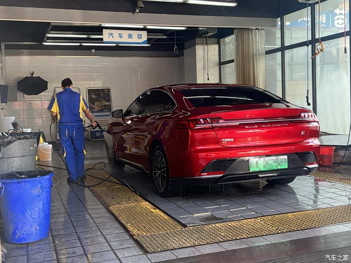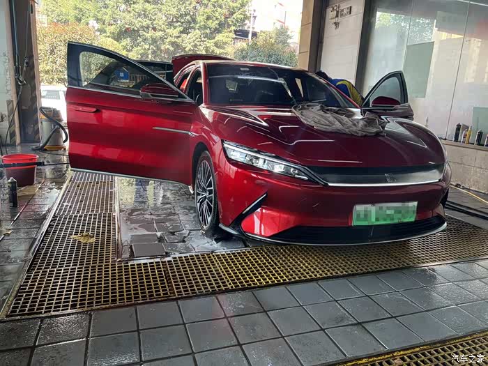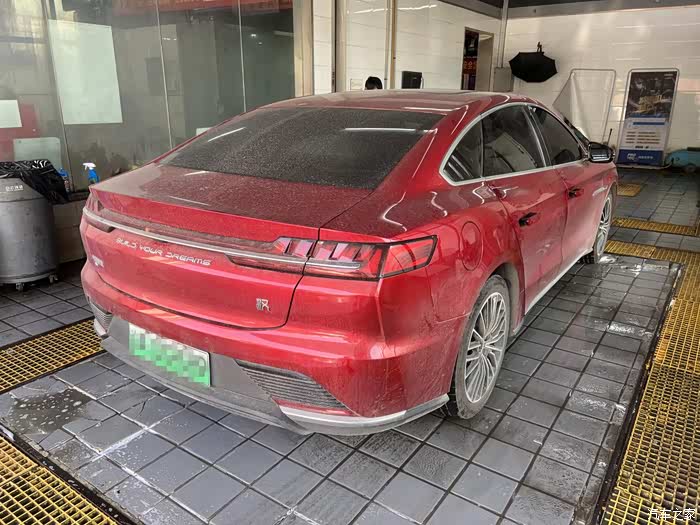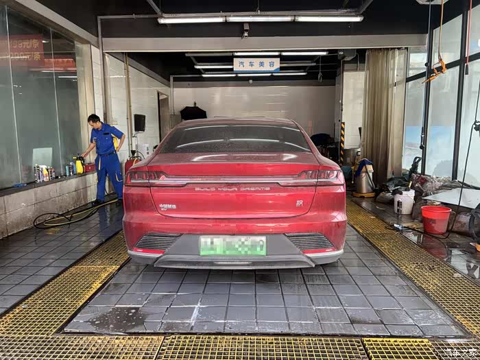 在大城市居住,想自己洗车就不那么容易了,首先场地就不允许,所以一般都是去外面的美容店清洗。周末决定把这辆汉EV开去洗洗,五一期间跑了小长途,车已脏得没法看~