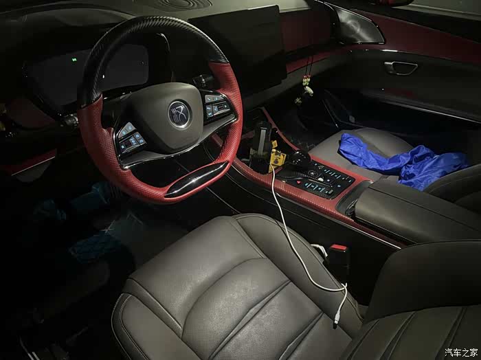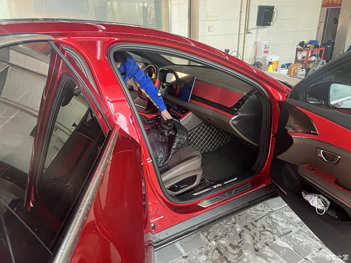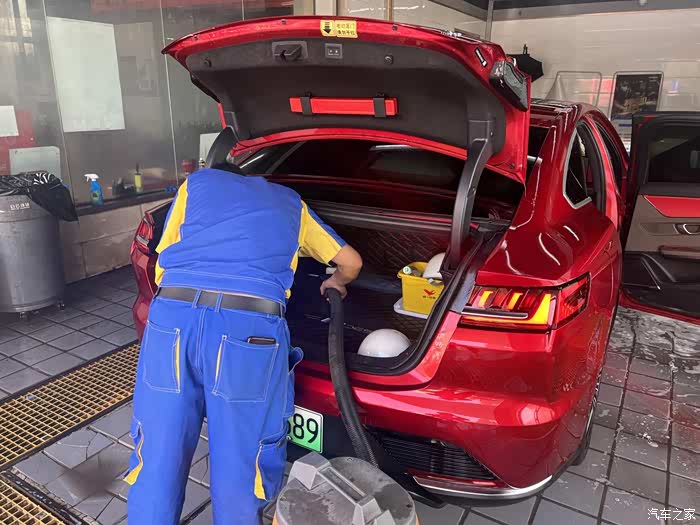 开始清理车内,汉EV的后备厢还不错,虽是轿车,但是蛮能装,平常外出自驾可以放两个行李箱进去。